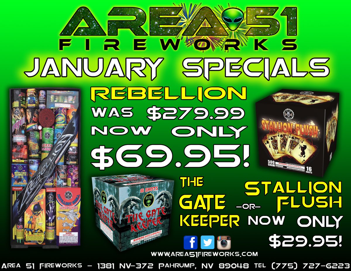 Area 51 Fireworks On Twitter Pahrump January Specials Rebellion Assortment Only 70 Was 280 Gate Keeper Or Stallion Flush Only 30 Https T Co Ddehahwfqt